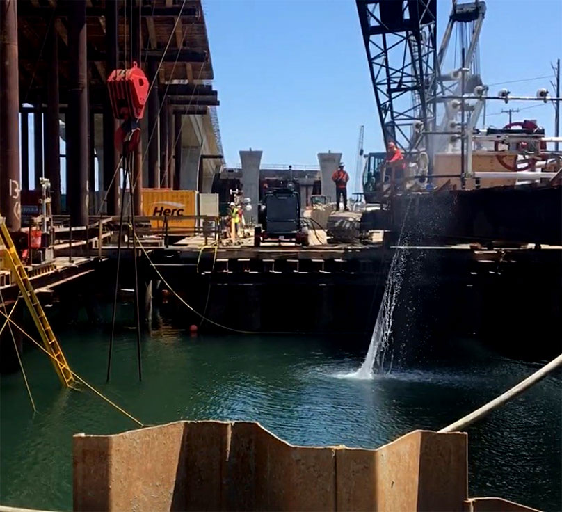Penhall assembled and managed a team of contractors and divers to expose, cut and extract over 4,300 cu yards of Pier structure from under the Schuyler Heim Bridge. Over 250 separate pieces of concrete, ranging in size from 14 tons to 74 tons, were cut, rigged and removed from depths of up to -71′ below the surface of the Cerritos Channel. This process required over 40,000 square feet of wire sawing and 2500 lineal feet of core drilling to complete safely and ahead of schedule, allowing Caltrans to proceed with construction of the new bridge structure.